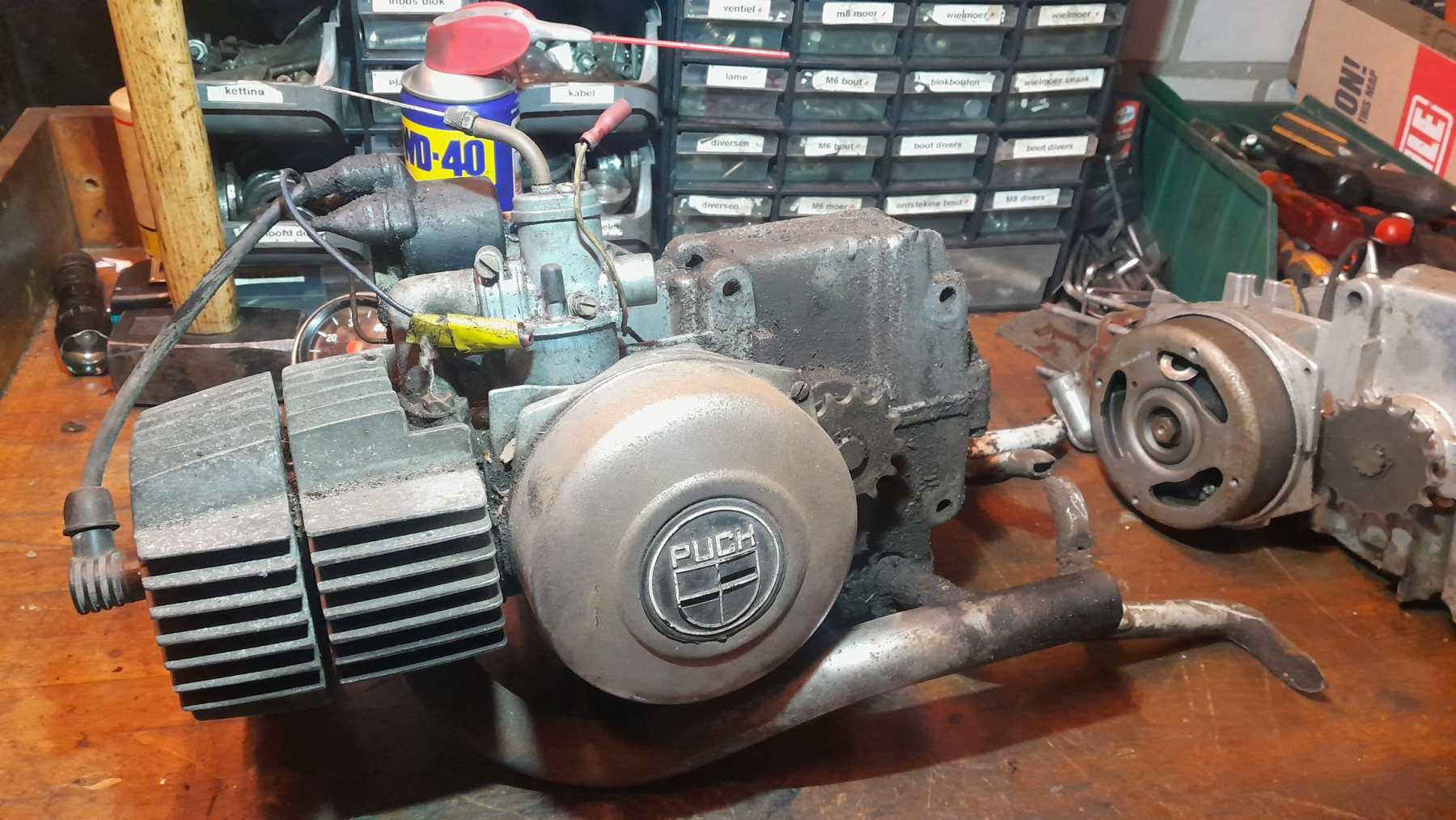 Puch Maxi 4 gelagerd aangepast motorblok. 48.8cc NOS Original Old Stock! cilinderset. MLM nieuwe powerfilter. 12mm Bing met originele sproeierbuis en hoofdsproeier, X30 zijdelings spruitstuk. Bosch ontsteking welke al afgesteld staat. Veel compressie. Opgebouwd op nieuwstaat 4 gelagerd origineel onderblok. € 375